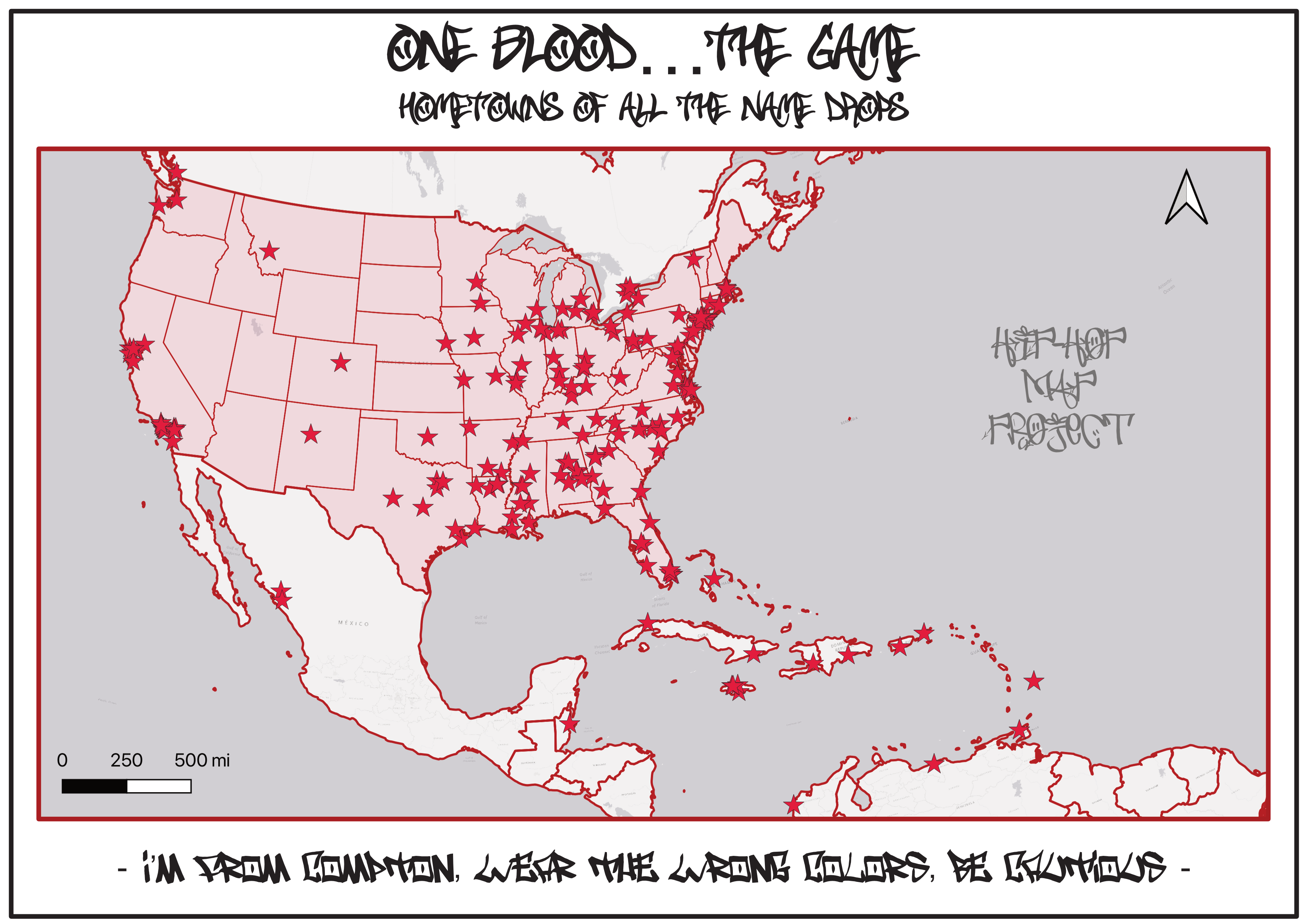 Everyone was mapped based on their hometowns or cities they were most known from. For example, Serena Williams was born in Saginaw, Michigan, but is notably from Compton, California. I aggregated location information to determine if The Game favors name-dropping people from any region in particular. Of course all points are symbolized as a nod to The Game’s membership in the Bloods.