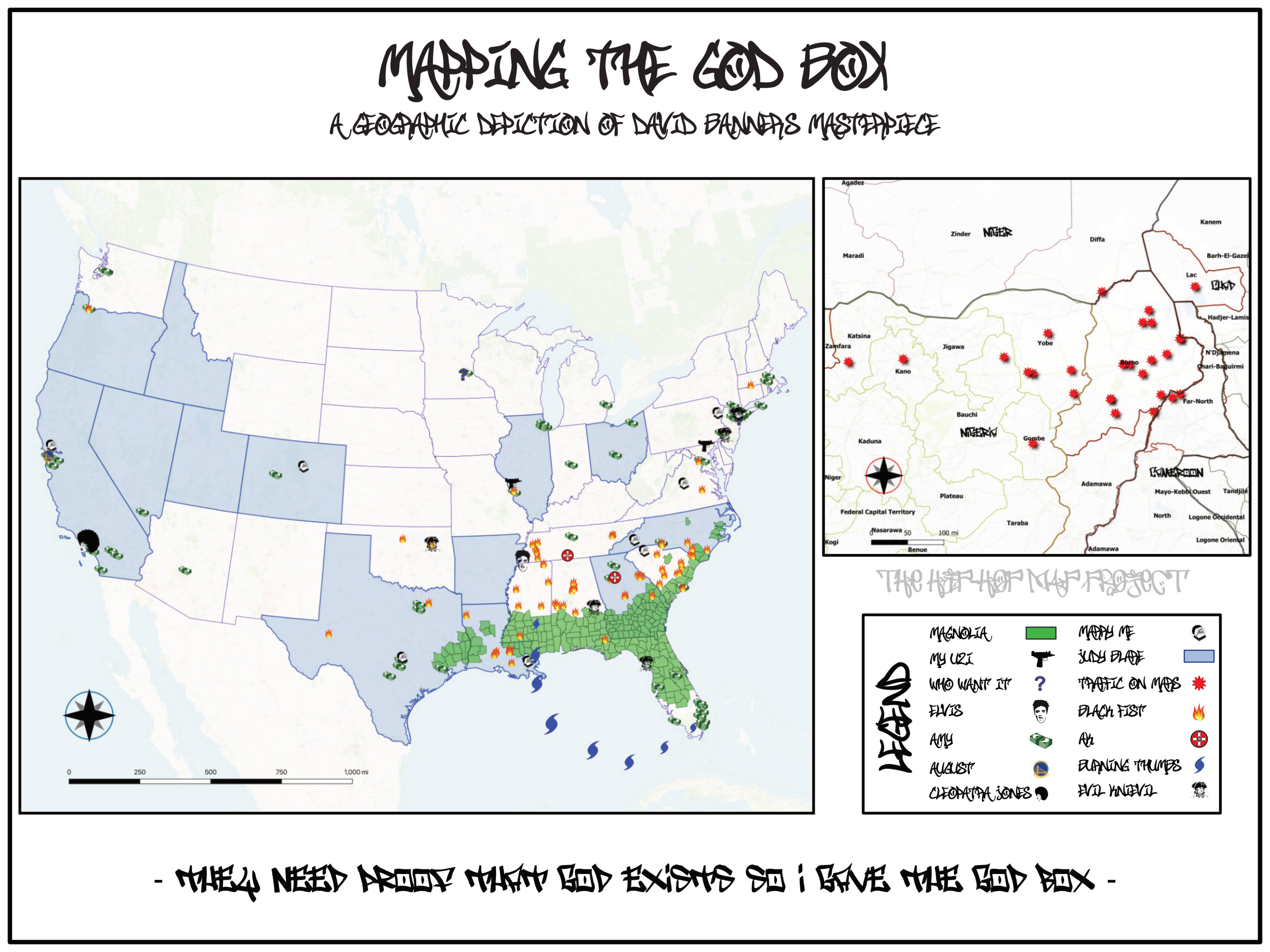 This map, and arguably the Hip-Hop Map Project as a whole, is my “Wizdom Selah”. All this started as a way to figure out how to retain my GIS skills, and now it’s manifesting into a larger concept, a larger conversation about hip-hop. I will continue to use geography to influence the culture as I create and tap into my divine power.