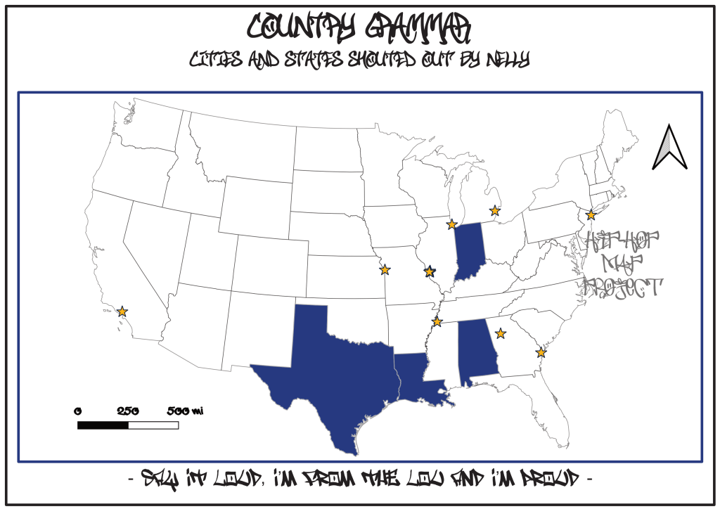 In the song Nelly shouts out a few cities and states that are no strangers to speaking that country grammar, albeit some not even in the American South. In total Nelly lists 16 places: 4 states, 11 cities, and one street. The street, Kingsland Ave, is obviously not shown due to the scale of the map. The symbology is derived from the uniform colors of the St. Louis Blues, with blue states and yellow stars for cities.