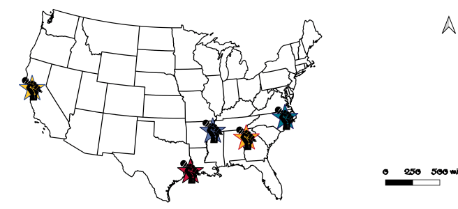 For this one I mapped where each artist was from and matched the location with a lyric in their bars. Each place is symbolized with a mic in hand and start background. I selected NBA colorways for the stars; if you follow E-40 you know he’s an avid sports fan and is often found courtside at Golden State Warriors home games. Each star is symbolized based on the closest NBA team to the emcee’s hometown: – E-40, Vallejo, CA (Golden State Warriors) – Petey Pablo, Greenville, NC (Charlotte Hornets) – Bun B, Port Arthur, TX (Houston Rockets) – Eightball, Memphis, TN (Memphis Grizzlies) – Lil Jon, Atlanta, GA (Atlanta Hawks)