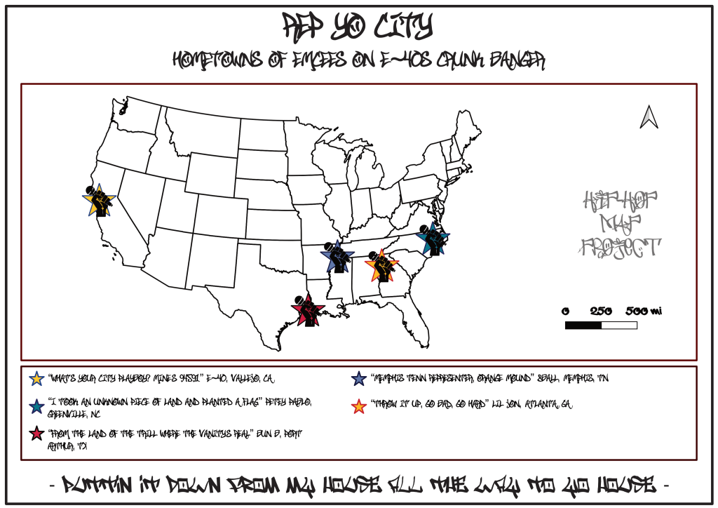 “Rep Yo City” is a perfect song for the Hip=Hop Map Project: five emcees from five different places, all talking about where they’re from. When I first started making these maps I wanted to highlight our culture’s rich bond with geography, and this song sums it up.